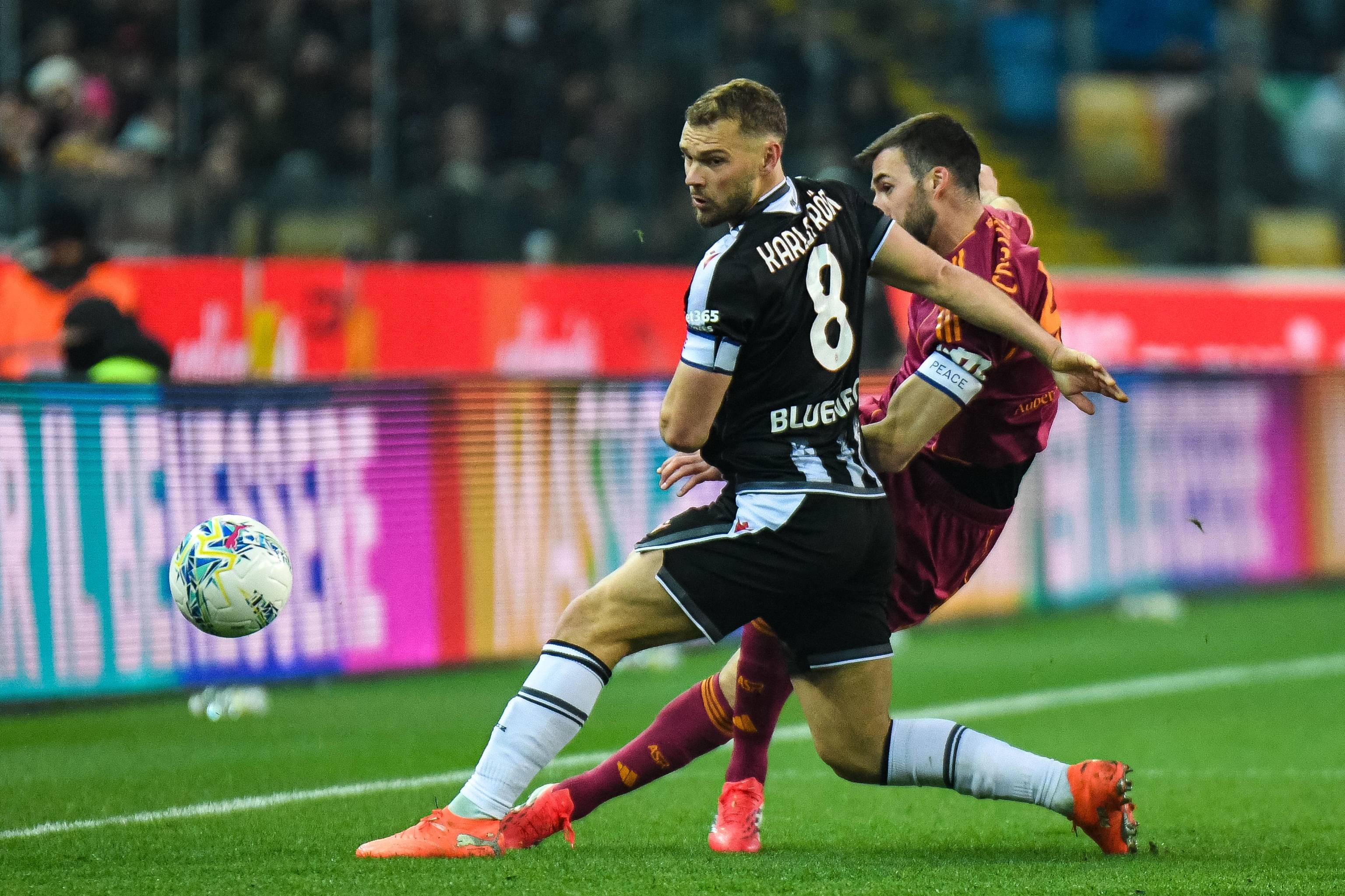 เมื่อวันที่ 2 กุมภาพันธ์ คาร์ลสตรอม ผู้เล่นของอูดิเนเซ่ (ซ้าย) เข้าปะทะกับคริสตันเต้ ผู้เล่นของโรม่า เพื่อแย่งบอล ชินหัว/EPA