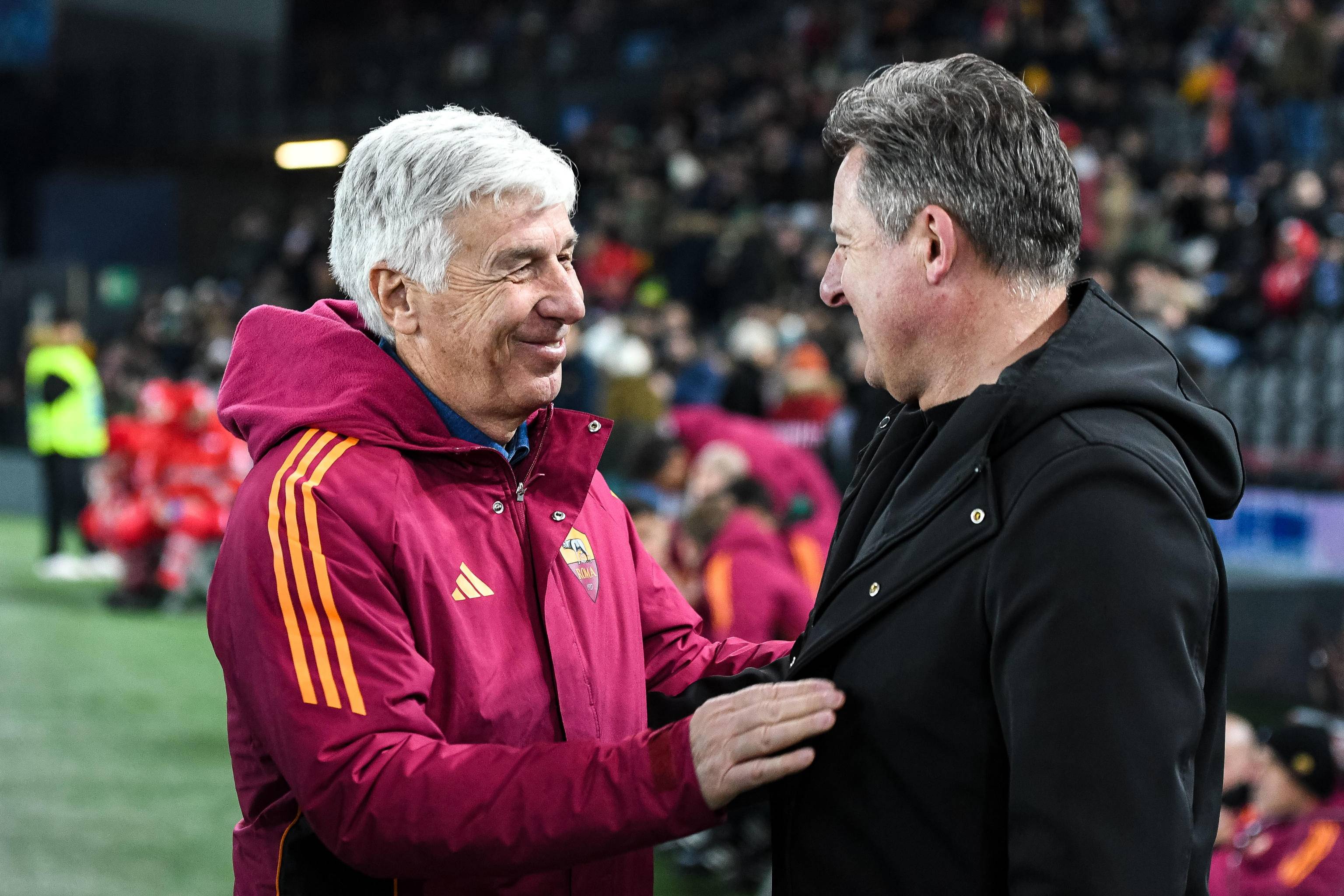 เมื่อวันที่ 2 กุมภาพันธ์ ผู้จัดการทีมอูดิเนเซ่ รุนิช (ขวา) แลกเปลี่ยนคำพูดกับผู้จัดการทีมโรม่า กัสเปรินี่ ก่อนการแข่งขัน ซินหัว/EPA