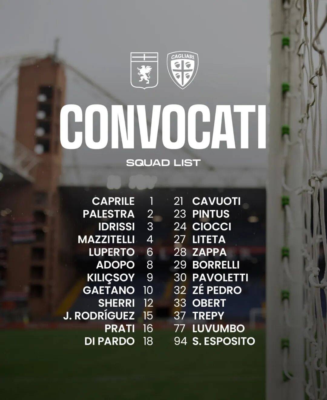 คาลยารีอยู่ในอันดับที่สิบห้า ห่างจากฟิออเรนติน่าห้าคะแนน ทีมไม่มีมินา, ไมเคิล โฟโลรุนโช, มัตเตีย เฟลิชิ และอเลสซานโดร เดอีโอลา ขณะที่โรจได้ยกเลิกสัญญากับสโมสรแล้ว เปโดรกลับมาจากการบาดเจ็บแล้ว แต่มินาได้รับบาดเจ็บที่เข่าจากการฝึกซ้อมกองกลางแพลตต์ยังคงได้รับความสนใจจากโตริโน่ แม้ว่าการเจรจายังคงอยู่ในขั้นเริ่มต้น คาลยารีมีผลงานที่ย่ำแย่ที่สนามเฟอราริสของเจนัว โดยชนะเพียงสองครั้ง เสมอสองครั้ง และแพ้สิบสองครั้งจากการพบกันสิบหกครั้งล่าสุด ซึ่งเป็นสถานการณ์ที่น่ากังวลสำหรับทีมจากเกาะซาร์ดิเนียเมื่อพิจารณาจากฟอร์มการเล่นนอกบ้านที่แข็งแกร่งในฤดูกาลนี้ คาลยารีแพ้เกมเยือนสี่นัดในฤดูกาลนี้ โดยแพ้ทั้งหมดยกเว้นหนึ่งนัด ซึ่งเป็นการแพ้สองประตูให้กับลาซิโอ
