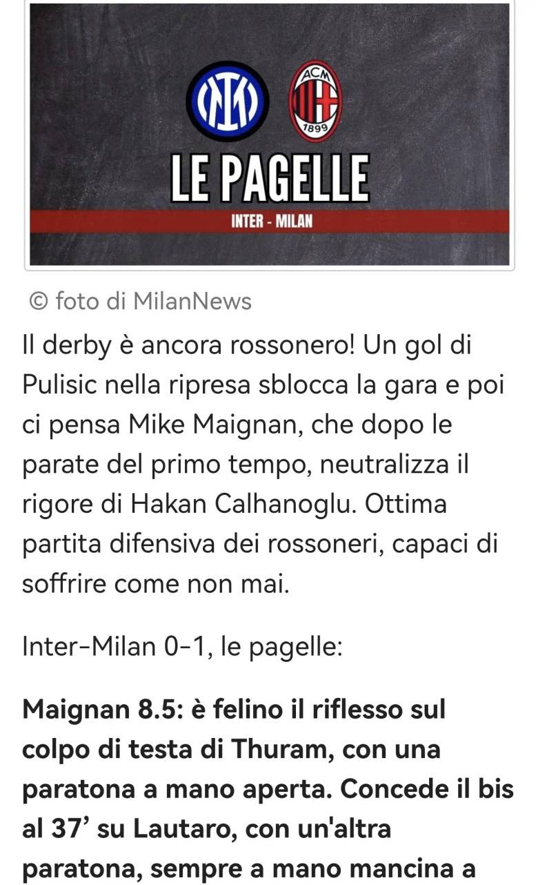 เอซี มิลาน เอาชนะ อินเตอร์ มิลาน 1-0 โดยคริสเตียน พูลิซิช ทำประตูชัยในครึ่งหลัง ไมค์ เมญ็อง เซฟลูกสำคัญหลายครั้ง (รวมถึงการปฏิเสธจุดโทษของฮาคาน ชัลฮาโนกลู) ขณะที่แนวรับแสดงความแข็งแกร่งอย่างมาก คะแนนมีดังนี้: