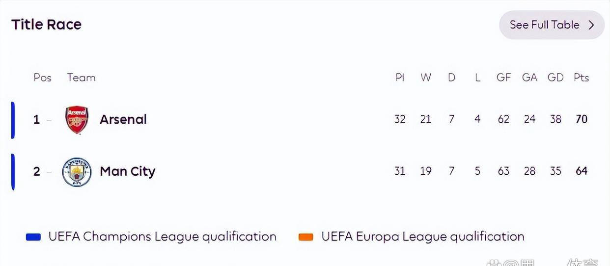 ปัจจุบัน อาร์เซนอล นำแมนเชสเตอร์ ซิตี้ ไป 6 แต้ม แต่บลูมูนลงเล่นได้น้อยกว่าหนึ่งเกม หากแมนเชสเตอร์ ซิตี้ สามารถเอาชนะคริสตัล พาเลซได้ในนัดที่แต่งหน้าก่อน จากนั้นเอาชนะอาร์เซนอลที่บ้าน ช่องว่างระหว่างทั้งสองฝ่ายจะแคบลงเหลือศูนย์แต้ม และแมนเชสเตอร์ ซิตี้ คาดว่าจะครองตำแหน่งสูงสุดด้วยผลต่างประตู ณ ตอนนี้ ผลต่างประตูของอาร์เซนอลคือ +38 และแมนเชสเตอร์ ซิตี้ คือ +35 แมนเชสเตอร์ ซิตี้ เหลืออีกสองเกม และหากพวกเขาชนะทั้งหมด ผลต่างประตูจะดีขึ้นอย่างแน่นอน เมื่อคะแนนสุดท้ายเท่ากัน ตำแหน่งของการแข่งขันชิงแชมป์จะถูกกำหนดโดยความแตกต่างของประตู ซึ่งบ่งชี้ว่าการต่อสู้ของ Tianwang Mountain จะไปด้วยกันในรูปแบบต่างๆ และผลลัพธ์ก็มีความสำคัญอย่างยิ่ง