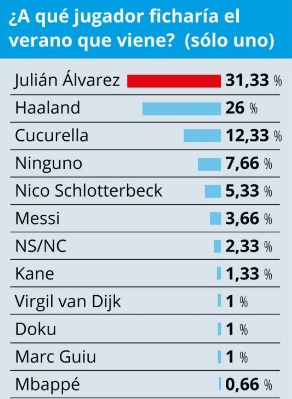 ลิโอเนล เมสซี อยู่ในอันดับที่หกของรายชื่อด้วยคะแนนเสียง 3.66% ขณะที่แฟนบอล 0.66% โหวตให้เซ็นสัญญากับ คีเลียน เอ็มบัปเป้ กองหน้าของเรอัล มาดริด – ซึ่งถือเป็นความปรารถนาที่ค่อนข้างแปลกประหลาดของกลุ่มคนส่วนน้อยมาก