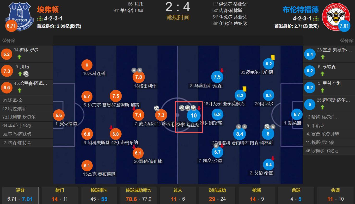 พรีเมียร์ลีก แมตช์เดย์ 20: เอฟเวอร์ตัน 2-4 เบรนท์ฟอร์ด. อิกอร์ ธิอาโก้ เริ่มต้นการแข่งขันและทำแฮตทริกได้, ได้รับคะแนนสูงสุดในเกม 10.0 (จาก 10).