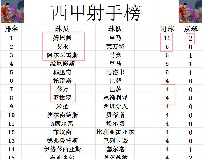 ในตารางคะแนน คีเลียน เอ็มบัปเป้ ขยายช่องว่างนำเป็นห้าประตู แม้จะพลาดจุดโทษที่อาจทำให้เขาทำประตูที่สองได้ อายอเซ เปเรซ ทำประตูได้หนึ่งครั้งในรอบนี้ ทำให้เขาเสมอกับจูลิอัน อัลวาเรซ ในอันดับสอง ทั้งคู่มีประตูรวมหกประตูวินิซิอุสไม่สามารถทำประตูได้ ทำให้เขาเสมอกับมูริชที่ห้าประตูในอันดับที่สี่ร่วมกัน ลีวายันดอฟสกี ซึ่งไม่ได้ลงเล่นในรอบนี้ ไม่สามารถเพิ่มประตูของเขาได้ และปัจจุบันอยู่ในอันดับที่สิบร่วมกับโอเยาร์ซาบาล, โรเมโร และผู้เล่นคนอื่น ๆ ที่ทำประตูได้สี่ประตูเท่ากัน