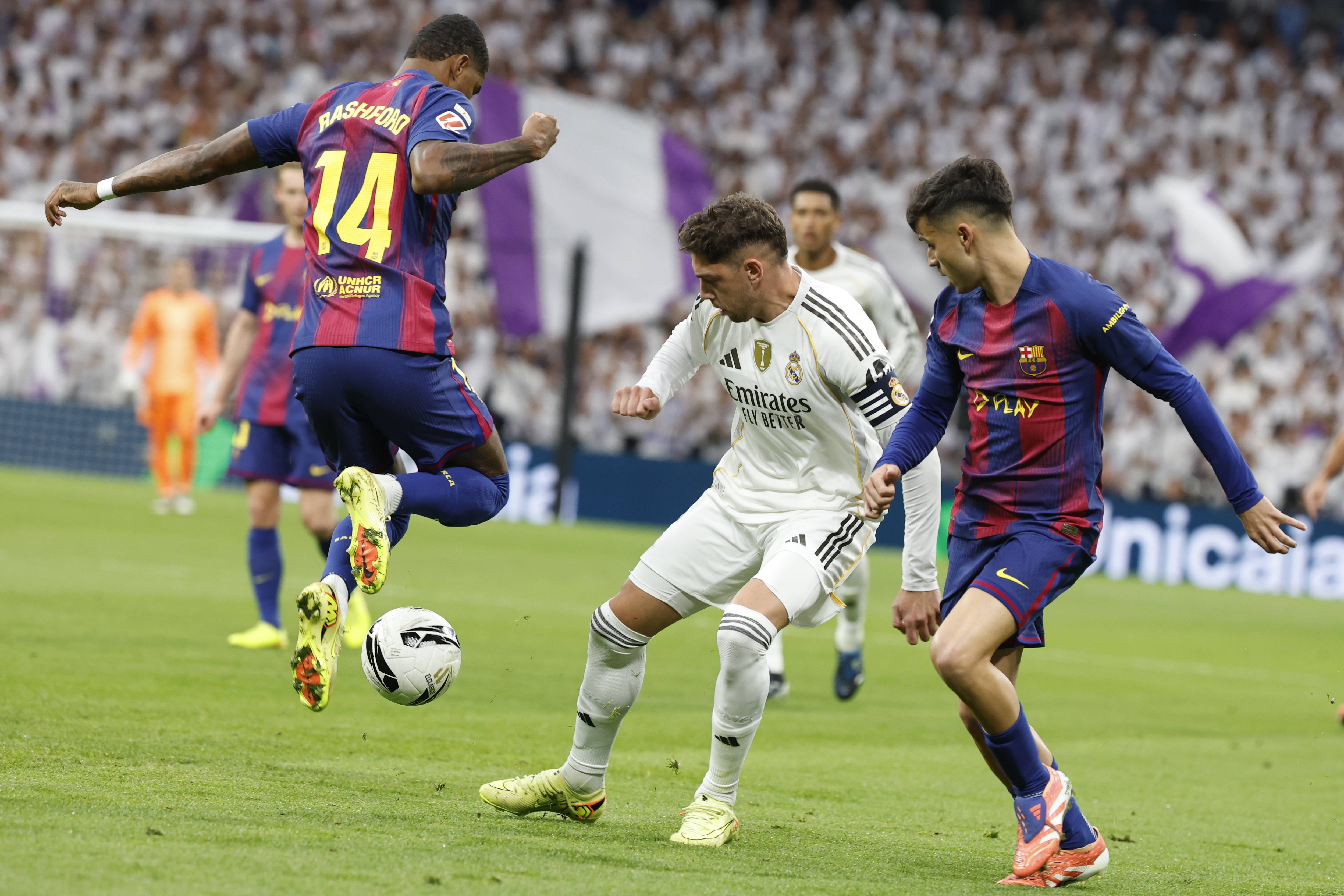 เมื่อวันที่ 26 ตุลาคม เฟเดริโก้ บัลเบร์เด้ (กลาง) ของเรอัล มาดริด เข้าปะทะกับ มาร์คัส แรชฟอร์ด (ซ้าย) ของแมนเชสเตอร์ ยูไนเต็ด และ เปดรี ของบาร์เซโลนา เพื่อแย่งบอล. ซินหัว/อีพีเอ