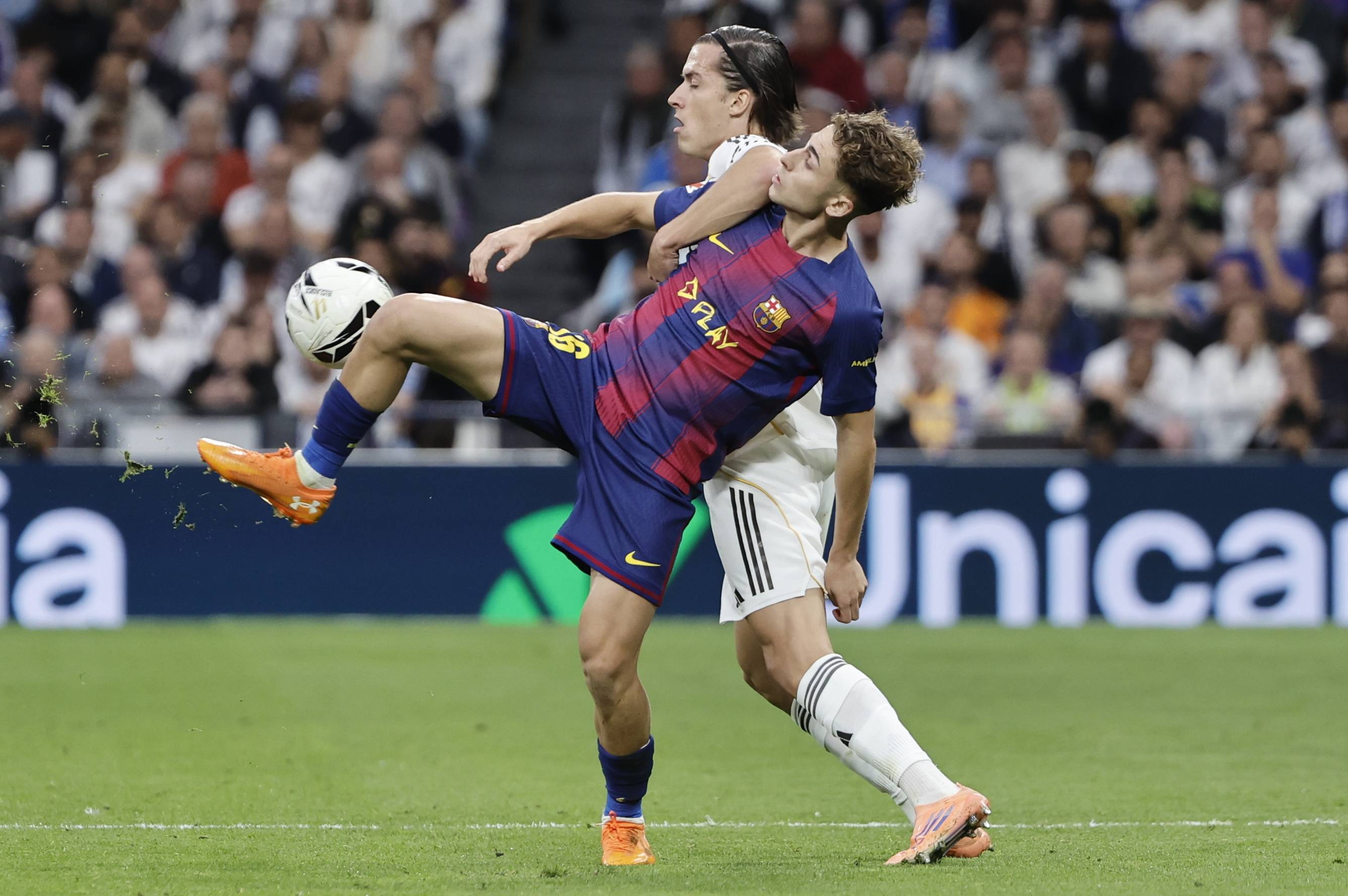 เมื่อวันที่ 26 ตุลาคม คาร์เรราสของเรอัล มาดริด (ขวา) เข้าปะทะกับคูเด้ของบาร์เซโลนาเพื่อแย่งบอล ซีเอ็นเอ/อีพีเอ