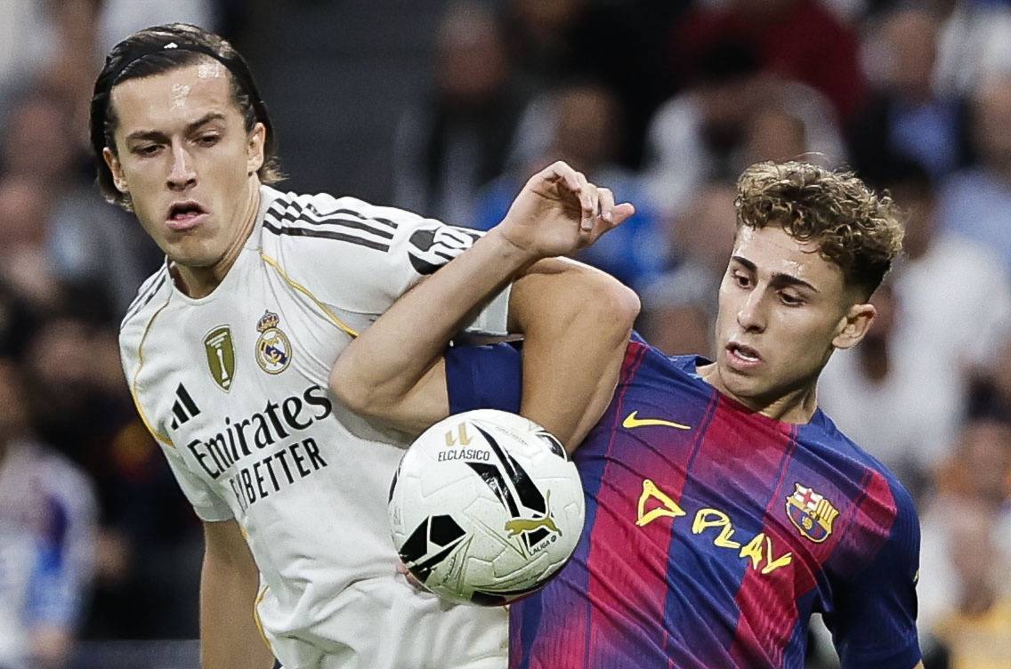 เมื่อวันที่ 26 ตุลาคม คาร์เรราสของเรอัล มาดริด (ซ้าย) ท้าทายเฟอร์มิน โลเปซของบาร์เซโลนาเพื่อแย่งบอล ซินหัว/EPA