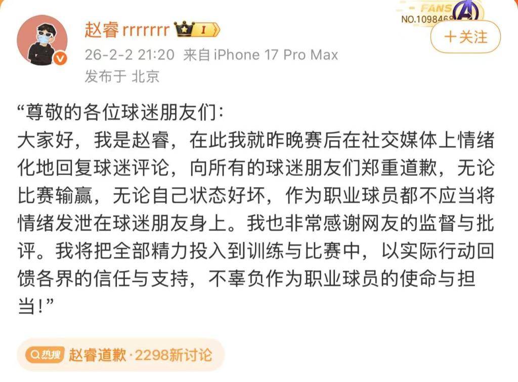 จ้าวรุ่ย เขียนบน Weibo: "เรียนแฟนๆ ที่รักทุกท่าน ผมคือจ้าวรุ่ย ผมขอแสดงความขอโทษอย่างจริงใจต่อแฟนๆ ทุกคนสำหรับการตอบสนองทางอารมณ์ของผมต่อความคิดเห็นบนโซเชียลมีเดียหลังการแข่งขันเมื่อคืนนี้ ไม่ว่าผลการแข่งขันหรือฟอร์มการเล่นส่วนตัวจะเป็นอย่างไร นักกีฬาอาชีพไม่ควรระบายความหงุดหงิดใส่แฟนๆ อย่างเด็ดขาดข้าพเจ้ารู้สึกซาบซึ้งใจอย่างยิ่งต่อการดูแลและคำวิจารณ์ที่สร้างสรรค์จากชาวเน็ตทุกท่าน ข้าพเจ้าจะทุ่มเทพลังทั้งหมดให้กับการฝึกซ้อมและการแข่งขัน เพื่อตอบแทนความไว้วางใจและการสนับสนุนจากทุกภาคส่วนด้วยการกระทำที่เป็นรูปธรรม และจะปฏิบัติหน้าที่ให้สมกับภารกิจและความรับผิดชอบในฐานะนักกีฬามืออาชีพ!
