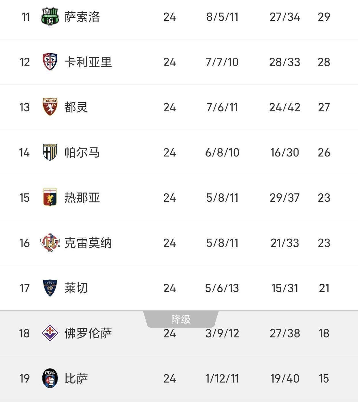 ในกลุ่มกลางตาราง อตาลันต้าตามหลัง โคโม อยู่สองคะแนน (39 ต่อ 41) และจะเผชิญหน้ากันโดยตรงในแมตช์เดย์ที่ 29 การต่อสู้เพื่อหนีการตกชั้นกลายเป็นสถานการณ์สามทางที่หยุดชะงัก: เครโมเนเซ่มี 23 คะแนน นำหน้าโซนตกชั้นเพียง 5 คะแนนเท่านั้น ขณะที่ปาร์มาและฟิออเรนติน่าต่างมี 17 คะแนนเท่ากัน ติดอยู่ในโซนตกชั้นอย่างแน่นหนา ส่วนเลชเช่สามารถไต่ขึ้นมาอยู่อันดับ 18 ชั่วคราวหลังจากเอาชนะอูดิเนเซ่ในรอบนี้ หลุดออกจากโซนอันตรายชั่วคราว