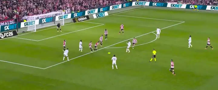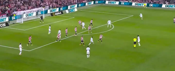 เขาพยายามบุกทะลุผ่านกลางสนามในตอนแรก แต่ฝ่ายตรงข้ามปิดกั้นเขาไว้ ทำให้เขาไม่สามารถก้าวหน้าได้ ด้วยเหตุนี้ เขาจึงเริ่มวนรอบไปมา เมื่อเขาไปถึงบริเวณที่เหมาะสม เขาส่งบอลให้กับเพื่อนร่วมทีมของเขา เบลลิงแฮม