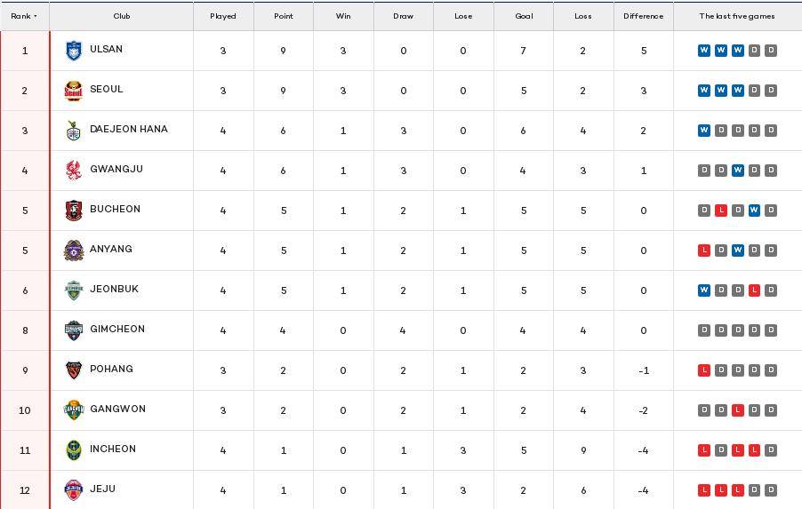 หลังจากรอบที่สี่ Ulsan และ Seoul อยู่ในอันดับที่หนึ่งในรายการ หลังจากที่แดจอนชนะ เขาอาศัยความได้เปรียบในการทำประตูเพื่อแซงกวางจูไปที่สาม โปฮัง กังหยวน อินชอน และเชจู อยู่ในอันดับสุดท้าย สุดสัปดาห์นี้ รอบที่ 5 ของ K1 League จะเริ่มแข่งขันกัน เมื่อทีมที่แข็งแกร่งเริ่มฟื้นความรู้สึกชนะ เกมจะน่าตื่นเต้นมากขึ้น
