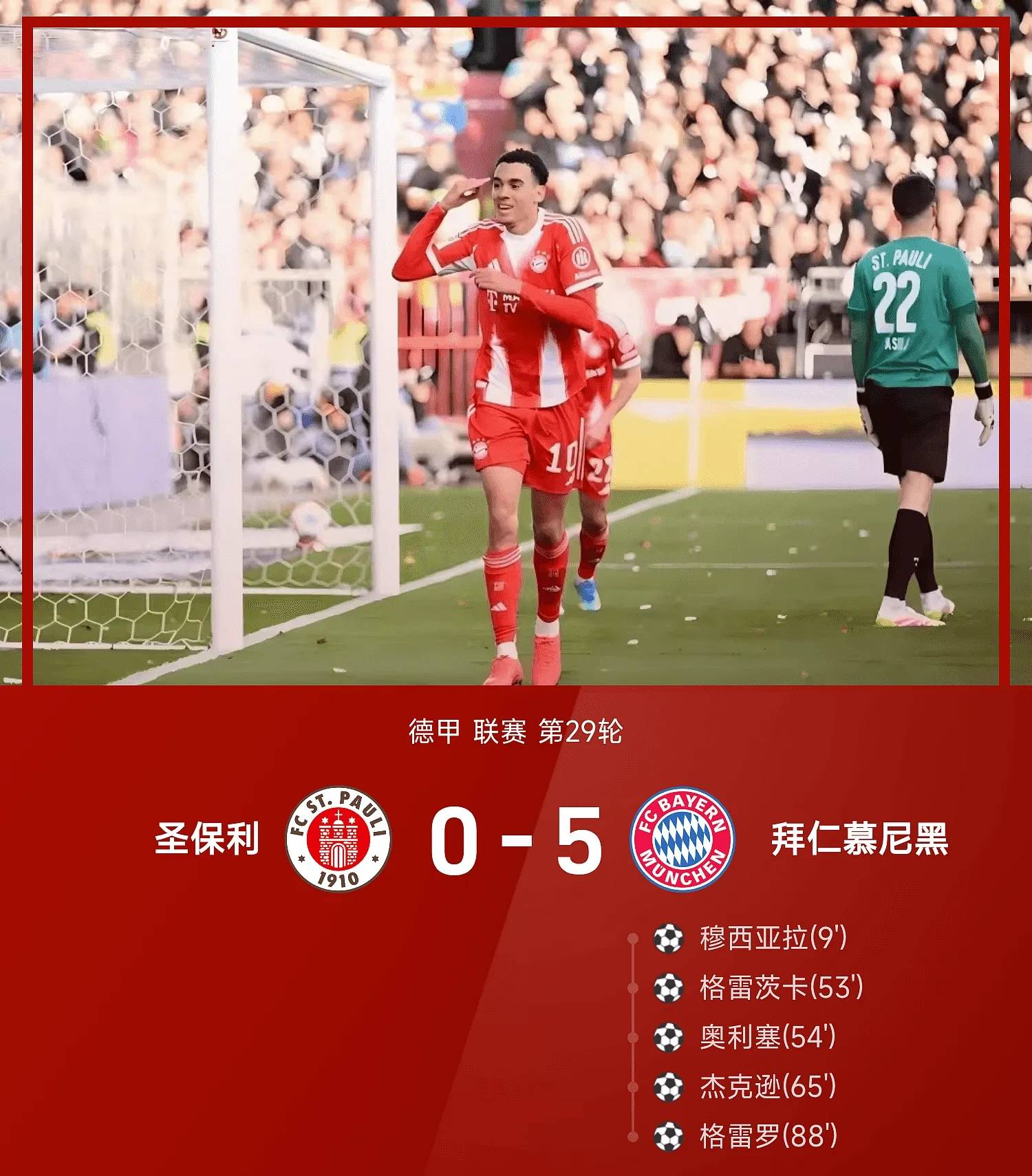 ในรอบที่ 29 ของบุนเดสลีกาในฤดูกาล 25/26 เซนต์เปาลีเล่นในบ้านกับบาเยิร์นมิวนิค ในครึ่งแรกมูเซียล่าแทรกหน้าประตูเพื่อพบกับเลเมอร์สเพื่อคว้าโหม่ง เกรตซ์ก้าทำคะแนนให้บาเยิร์น มิวนิคทำประตูที่ 102 ของบุนเดสลีกาในฤดูกาลนี้ โดยสร้างสถิติการทำประตูในฤดูกาลเดียวในประวัติศาสตร์บุนเดสลีกา โอลลิเซ่ยิงยาวจากนอกกรอบเขตโทษ แจ็คสันบุกเข้าเขตโทษ ตอบโต้การยิง และ เกร์เรโร บอลแตกก่อนจบและบุกเข้าเขตโทษเพื่อดันและยิงอีกลูก ในตอนท้ายของเกมบาเยิร์นมิวนิค 5-0 เซนต์เปาลีด้วยความได้เปรียบ 12 แต้มในมือเป็นผู้นำอันดับบุนเดสลีกา